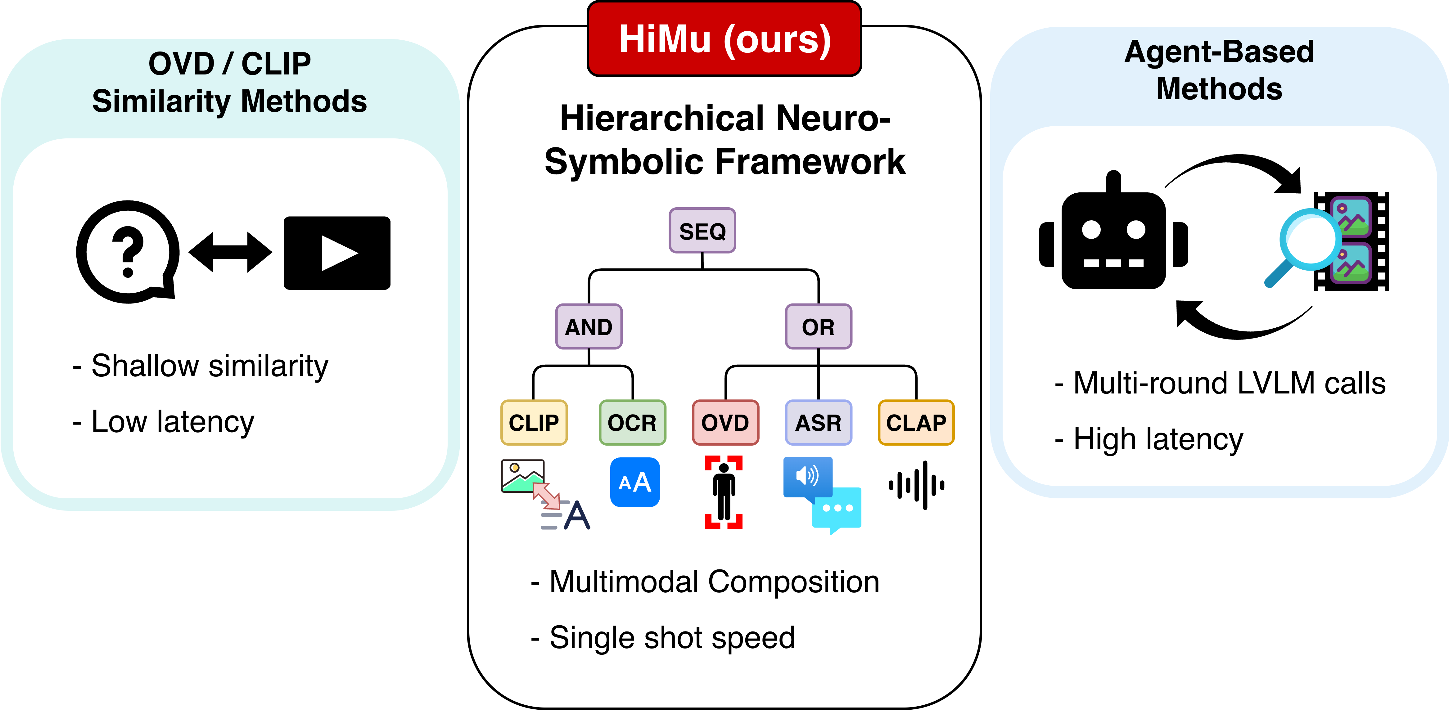 HiMu operates in four stages: it decomposes the query into a hierarchical logic tree, grounds each atomic predicate with a specialized expert, composes signals bottom-up through fuzzy-logic operators, and selects the most informative frames via Peak-And-Spread Selection.